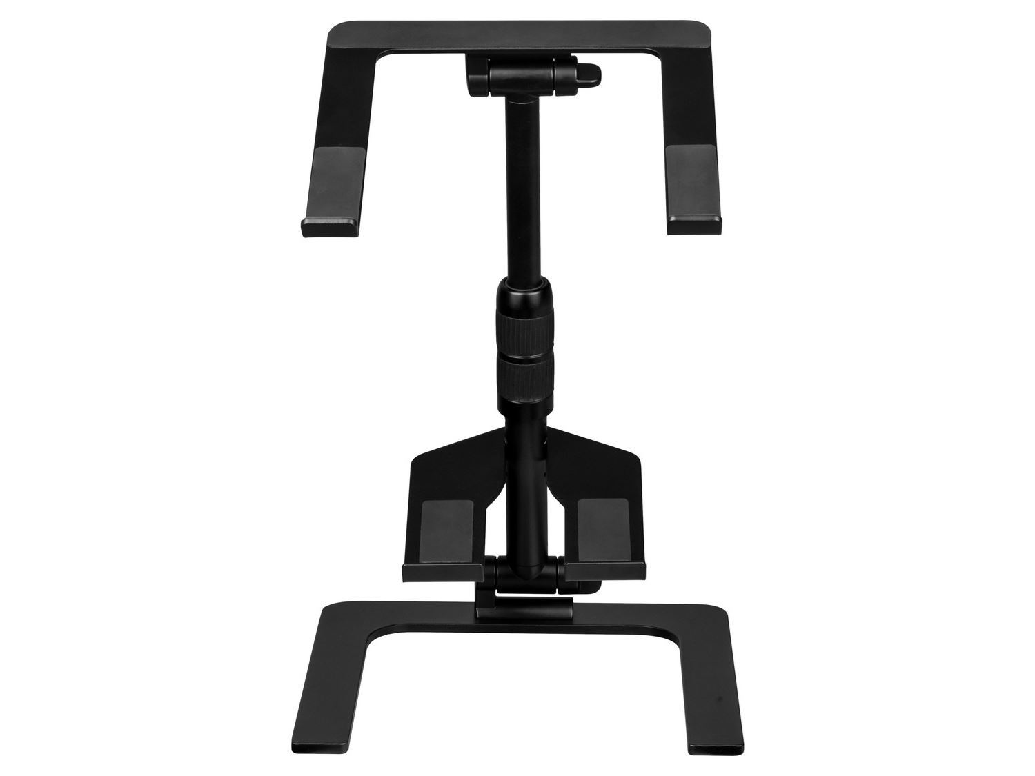 Supporto professionale per laptop, realizzato in acciaio ed alluminio pressofuso. Completamente regolabile e richiudibile, provvisto di una mensola regolabile per l'alloggiamento degli apparecchi di controllo. Fornito con una pratica borsa da trasporto in nylon. Colore Nero opaco.